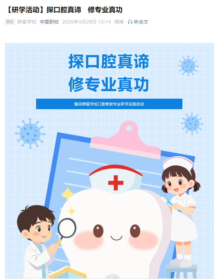 3月26日,隆回县骅星学校组织高二年级口腔修复工艺专业学生,赴隆回雅贝康口腔医院开展主题研学实践活动,让学子们走出校园,近距离感受行业实景,初步感受口腔专业的“大世界”。学校